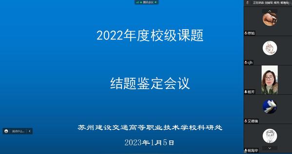 1月5日,科研处举办了2022年度校级课题线上结题鉴定会议。苏州工业职业技术学院刘绪军副处长、苏州城市学院杨海华副教授、我校杜利军主任、丛俊华处长、田峰高级讲师、艾德臻副教授四位校内专家受邀参与本次鉴定会议。会议由科研处处长杨芳主持,相关课题主持人以及课题组核心成员参加了本次会议。